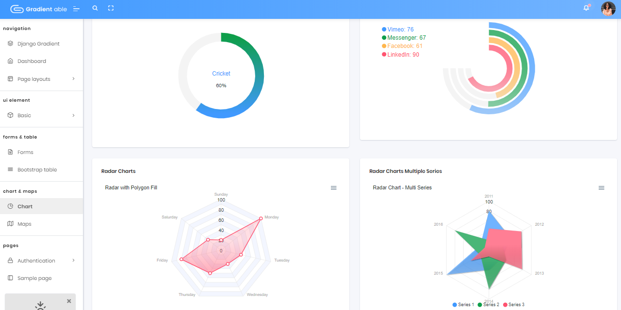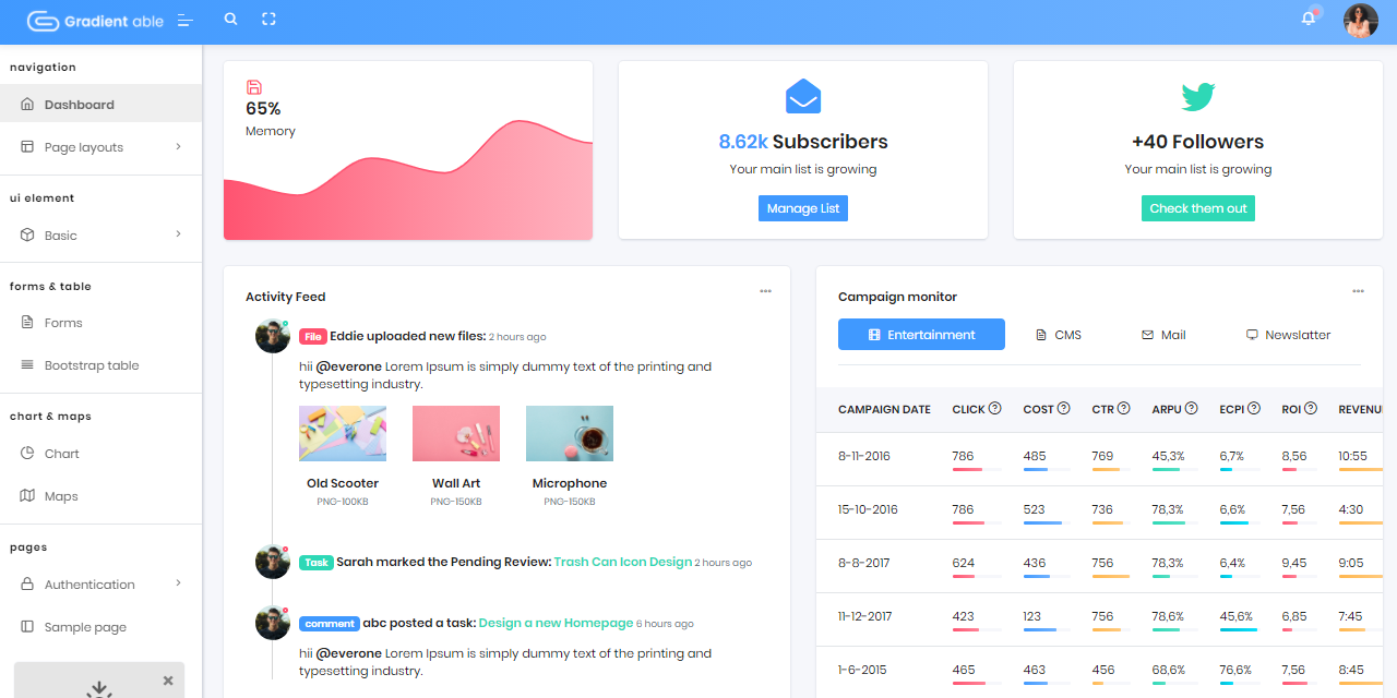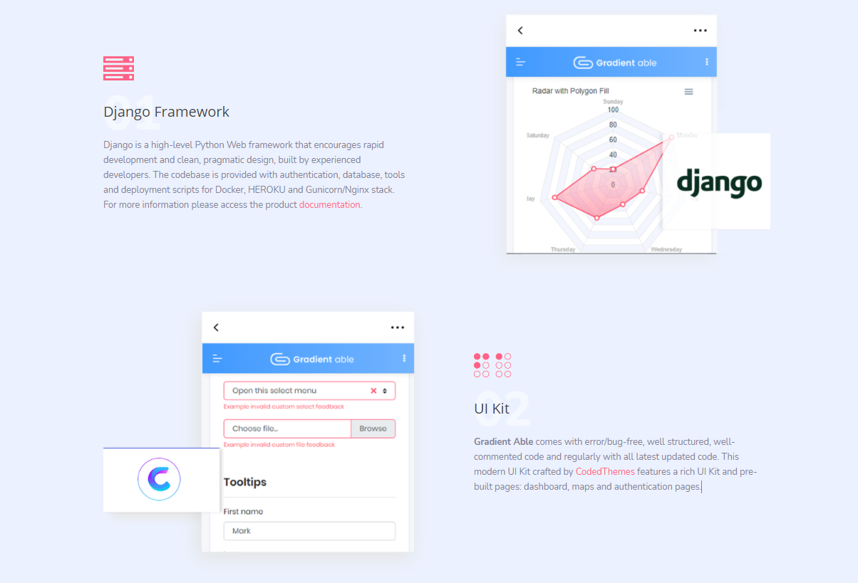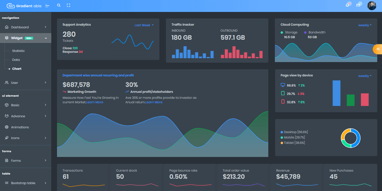 This article presents a curated list with free resources related to Gradient Able, a modern dashboard designed by CodedThemes agency. This open-source design is available in different technologies like Bootstrap, Angular, Flask, and Django and the permissive (MIT License) license allows the usage for hobby and commercial products. Gradient Able stands out from the crowd with an elegant look that combines soft gradient colors with well-suited typography and great cards and graphics.