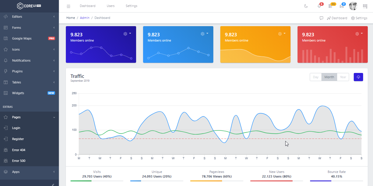 CoreUI is an Open Source Bootstrap Admin Template. But CoreUI is not just another Admin Template. It goes way beyond hitherto admin templates thanks to transparent code and file structure. And if that's not enough, let’s just add that CoreUI consists bunch of unique features and over 1000 high quality icons.