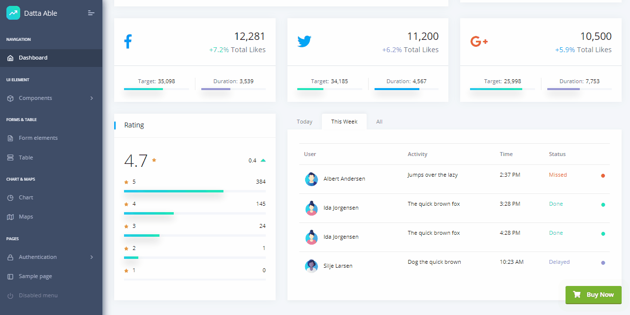 With performance, Datta Able rendering is fast in all major browser. It is passed through a good score in Google Page Speed, Pingdom, gtMetrix. Code passed via w3 validators with all w3 standards. This admin panel is fully responsive and tested in all retina devices. Datta Able provides multiple choices of widget, chart icons and many more features support. All come’s with a color combination of pleasant look and feel.