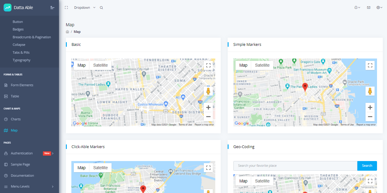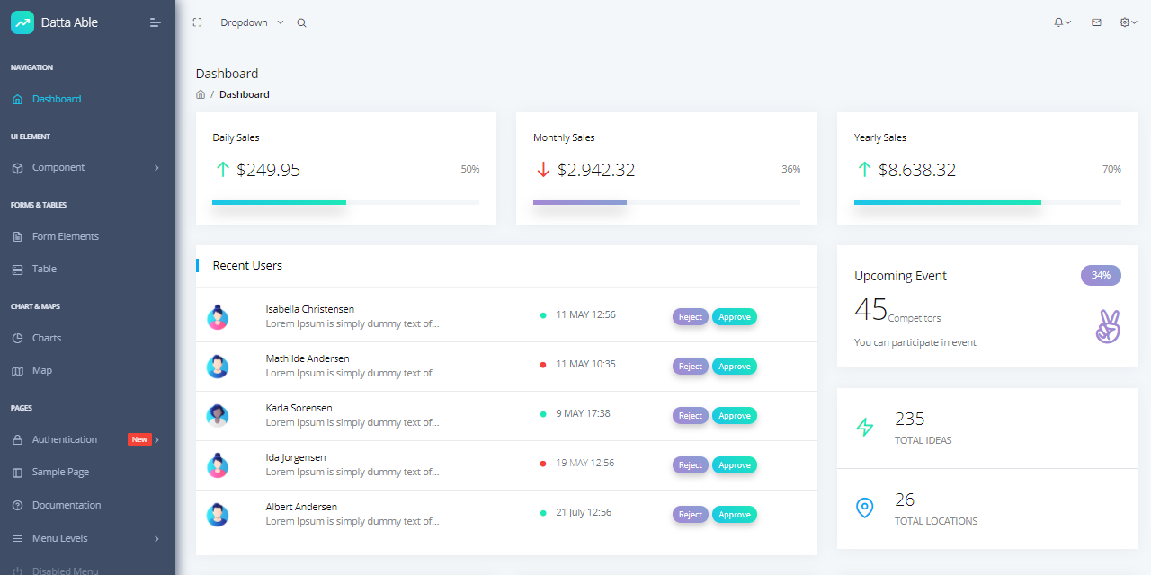 Datta Able React Free is the most stylised React Admin Template, around all other admin templates in the market. It comes with high feature-rich pages and components with fully developer centric code. Before developing Datta Able our key points were performance and design. While developing we have gone through various testing & code optimization process, for making this performance and design-centric backend application.