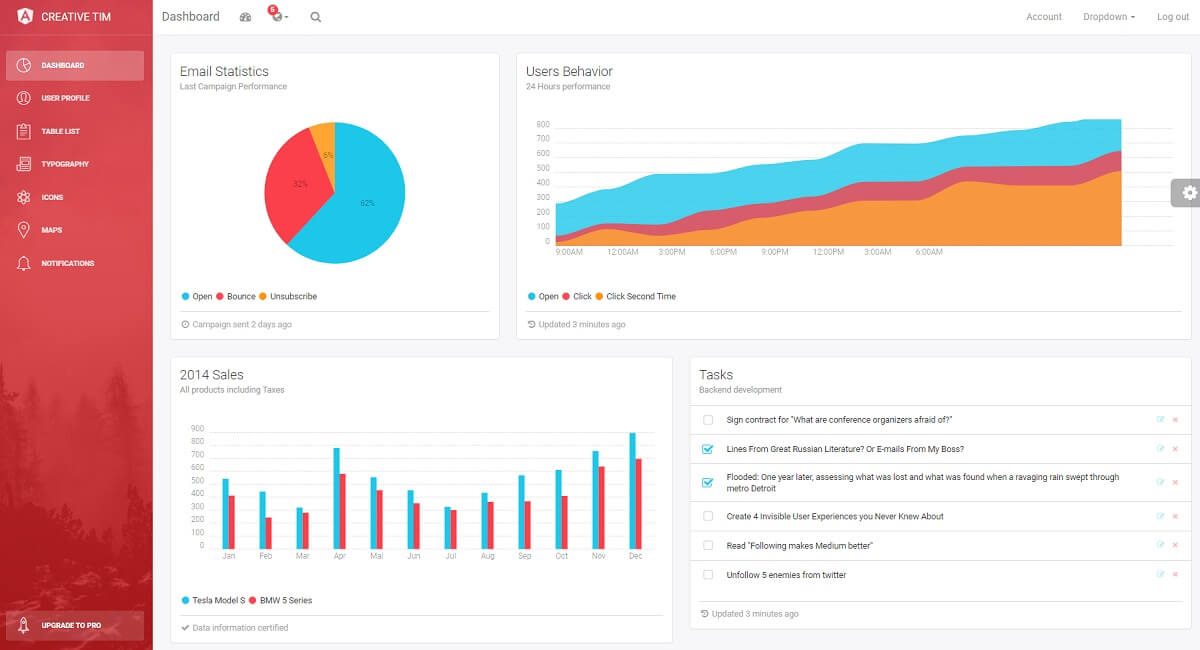 Light Bootstrap Dashboard Angular contains multiple handpicked and optimized plugins. Everything is designed to fit with one another. As you will be able to see, the dashboard you can access on Creative Tim is a customization of this product.