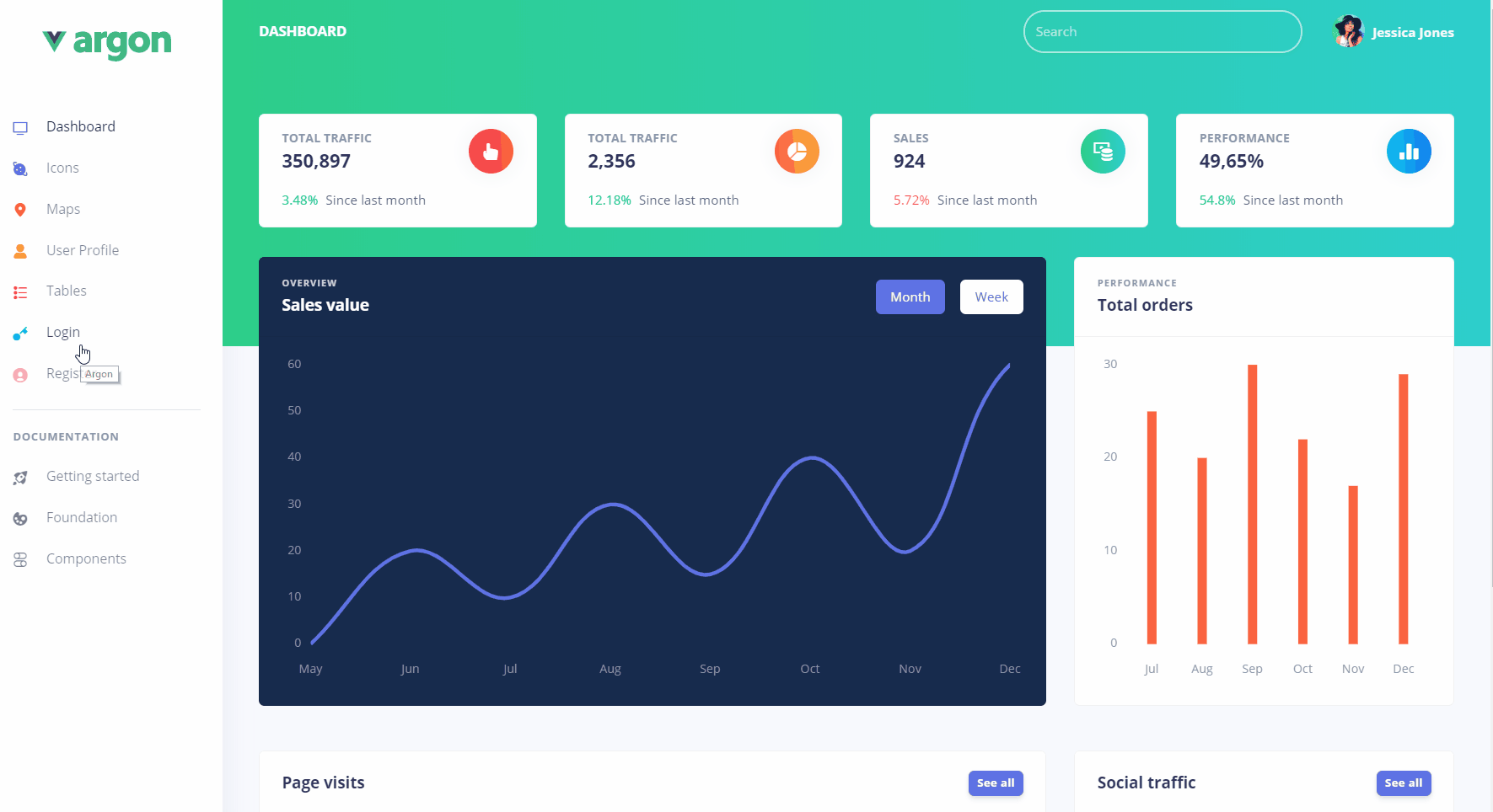 Vue Dashboard Argon is an admin panel designed by Creative-Tim built with over 100 individual components. Using this app, any developer with a piece of minimum Vue.js knowledge can build in a few hours a functional dashboard ready to be deployed in production.